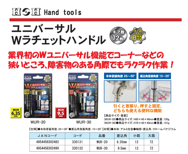 【商品名】(業務用9個セット) H&H Wユニバーサルラチェットハンドル/作業工具 【差込角:6.35】 8角形本体 ギア数72枚 WUR-20
