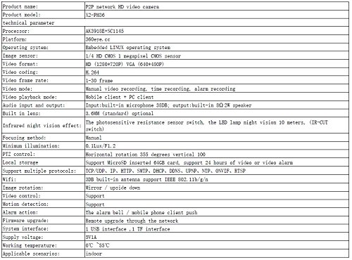 -. Feature : Resolution:1.0MP 1280*720 / Lens:3.6MM / IR Distance:5-10M / Wireless/WiFi / SD Card:Support upto 64GB SD Card