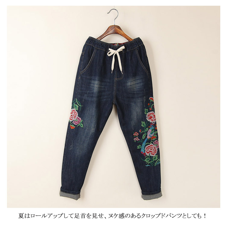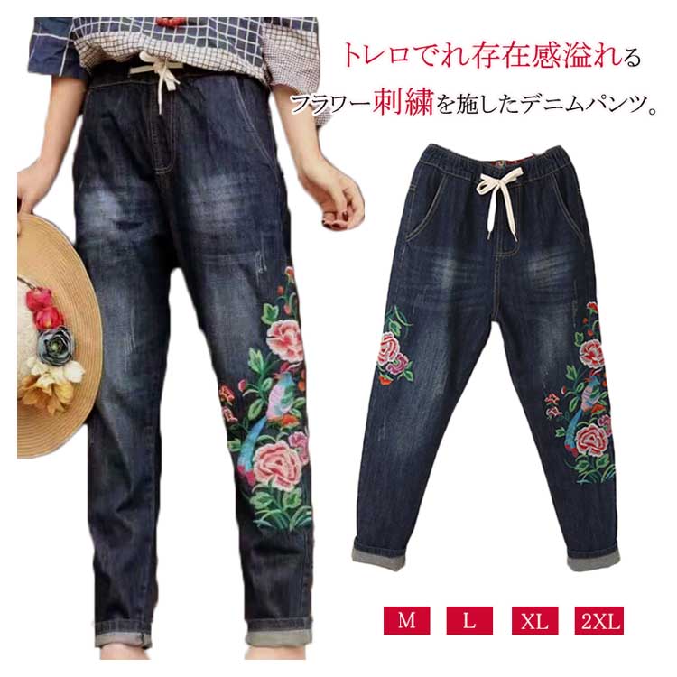 | トレロでれ存在感溢れるフラワー刺繍を施したデニムパンツ。ウエストは穿きやすいゴム使用になっているので、見た目以上に楽ちんに穿けるのも嬉しいポイント! ゆったりとしたシルエットが、気になるレッグラインをさり気なくカバーしてくれます。夏はロールアップして足首を見せ、ヌケ感のあるクロップドパンツとしても! | |