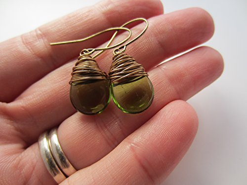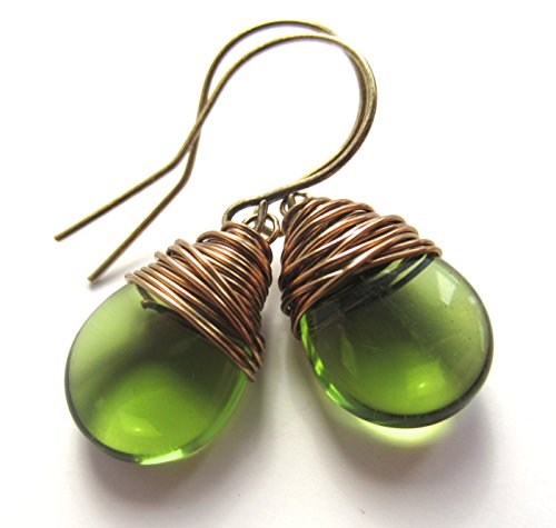 -. Title : Green Earrings Wire Wrapped Czech Glass Drops Antiqued Brass Wire