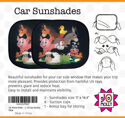 Your sunshades of high-quality fabric prevent glare and reduce heat to make the car trip more enjoyable. Why let your children look at a boring black sun shade when they can have these beautiful baby sun shades with farm animals?