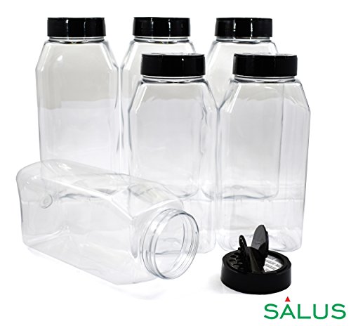 SALUSWARE - 6 PACK - 32 Oz with Black Cap - Plastic Spice Jars Bottles Containers – Perfect for Storing Spice, Herbs and Powders – Lined Cap - Safe Plastic – PET - BPA free - Made in the USA…