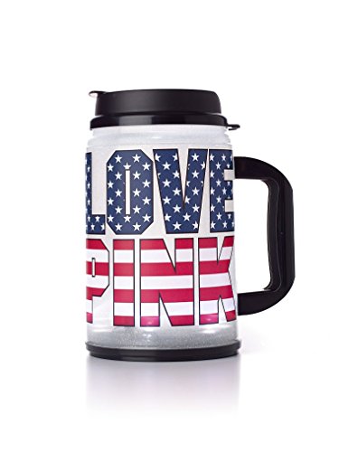 Pink by Victoria's Secret Light-Up 24 oz Chug Mug Americana. Hand Wash ONLY. Has a on off white button the bottom of Mug. Batteries can be replaced. Lights up/Lumieres. Lid lifts up to open has lift tab to drink from or put a straw in.Feature