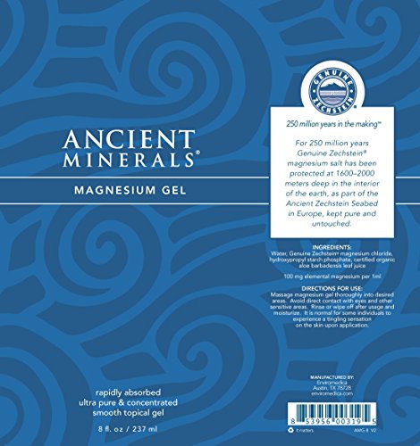 Ancient Minerals Magnesium Gel is a uniqued gelled formulation of our high purity ancient magnesium chloride and biologically active organic aloe vera extract in therapeutic amounts. This professional strength magnesium gel formulation was developed for sustained release of magnesium chloride and aloe vera polysaccharides by the skin. Ancient Minerals Magnesium Gel stays hydrated when applied, and is designed not to be fully absorbed.Feature