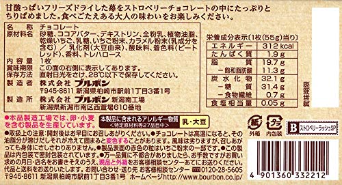 原材料:砂糖、ココアバター、デキストリン、全粉乳、植物油脂、乾燥いちご、乳糖、いちご粉末、カラメル粉末(乳成分を含む)/乳化剤(大豆由来)、酸味料、着色料(ビートレッド)、香料、トレハロース