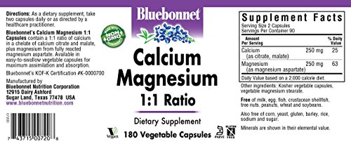 Bluebonnet's Calcium Magnesium 1:1 Ratio is used to improve bone support and reduce the risk of disease. Bluebonnet's Calcium Magnesium 1:1 provides a 1:1 ratio of calcium in a chelate of calcium citrate and malate, plus magnesium from full reacted magnesium aspartate. Available in easy-to-swallow vegetable capsules for maximum assimilation and absorption,.Feature