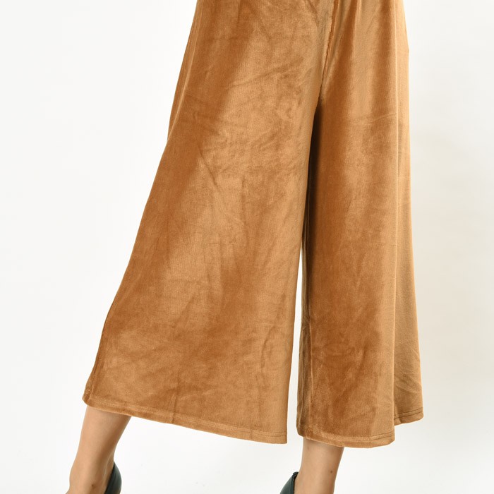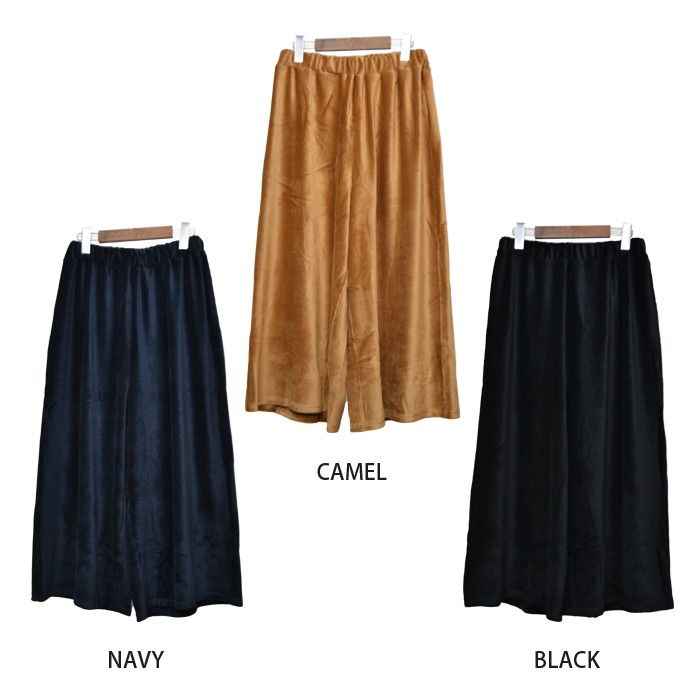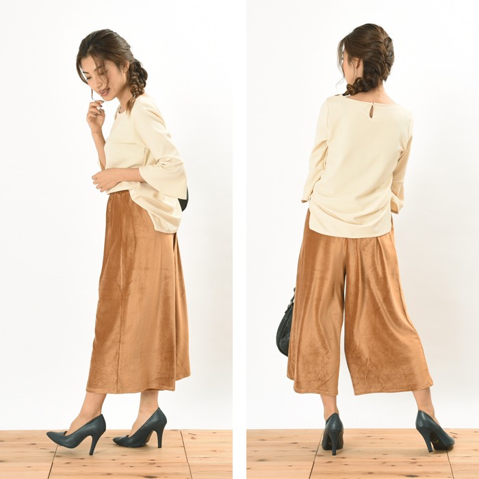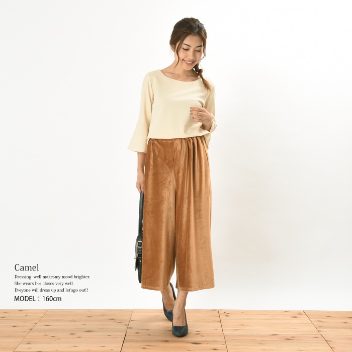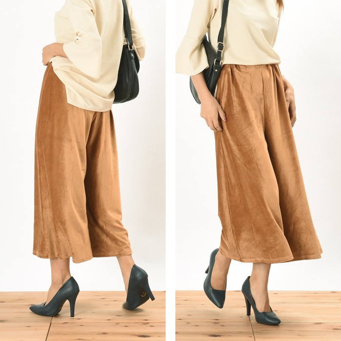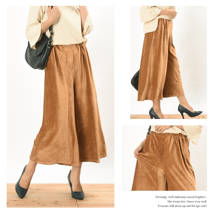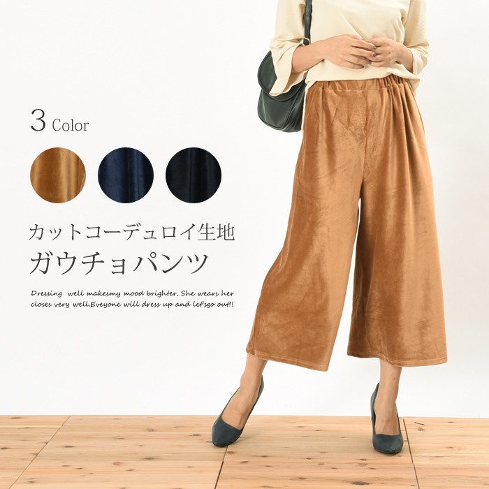 程よい立体感と光沢感のある素材で、伸縮性たっぷりで着心地が柔らかいカットコーデュロイ素材のガウチョパンツです。<br>オシャレな雰囲気がありシンプルなデザインなので、着回しがしやすくこなれ感があり幅広い年齢層の方に大人気です♪<br>さらっと着れて、こなれ感が出るのでワードローブにお使いいただけます。<br><br>Mサイズ Lサイズ<br><br><br>