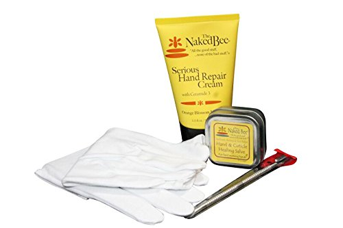 Great stocking stuffer or holiday exchange gift! Includes 4 great hand and nail care product: Naked Bee's brand new Serious Hand Deep Repair Cream (3.25 oz), Naked Bee's hand & cuticle healing salve (1.5 oz, a stainless steel cuticle pusher and a pair of moisturizing gloves.