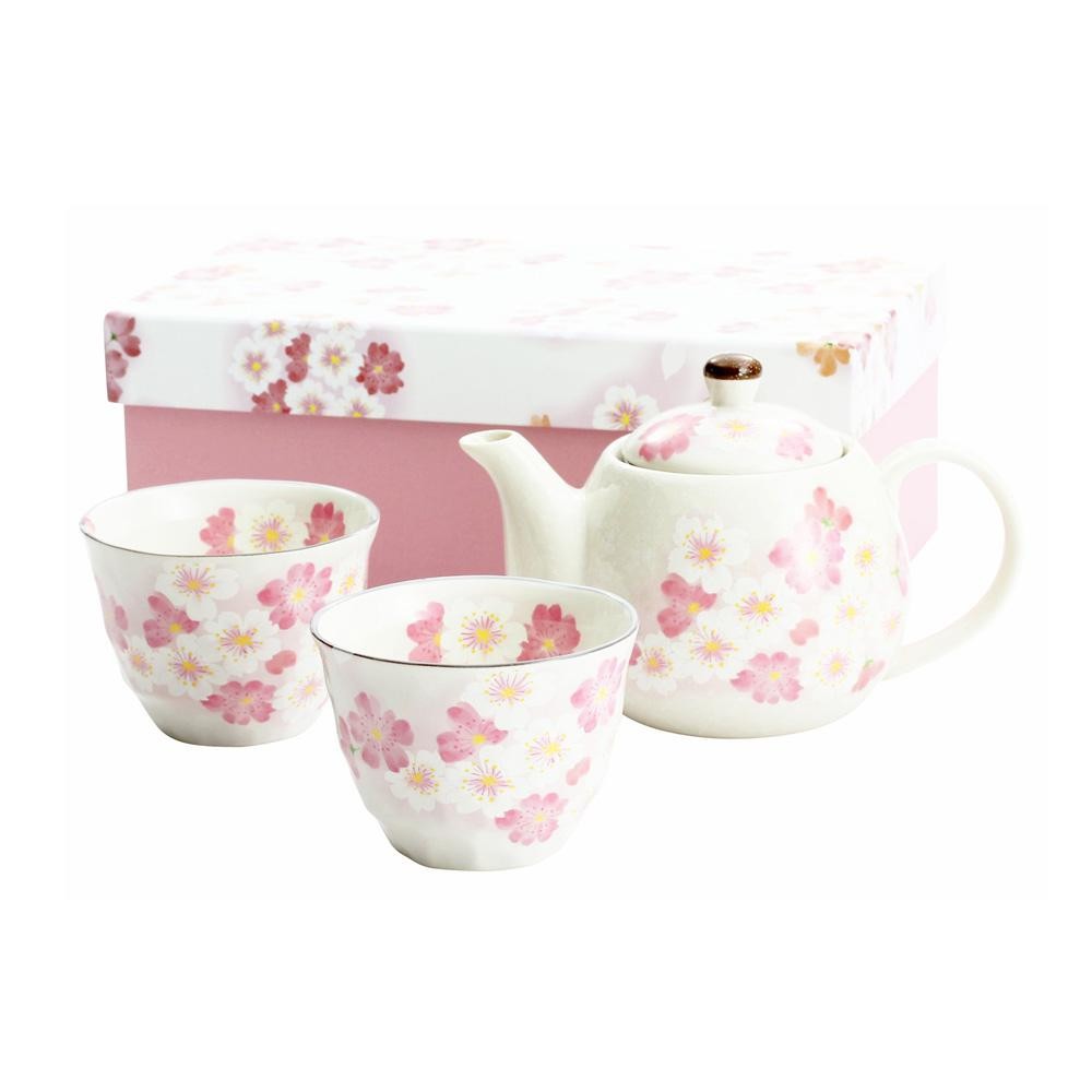 | 可憐に咲き誇る桜を描いた煎茶碗とポットのセットです。煎茶碗やポットと同じ柄の化粧箱に入っているので、ギフトにもぴったり。 |