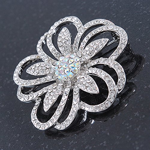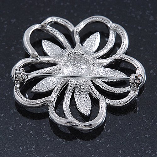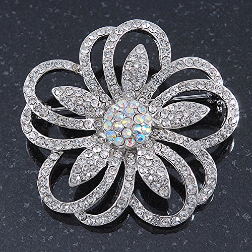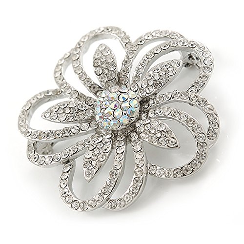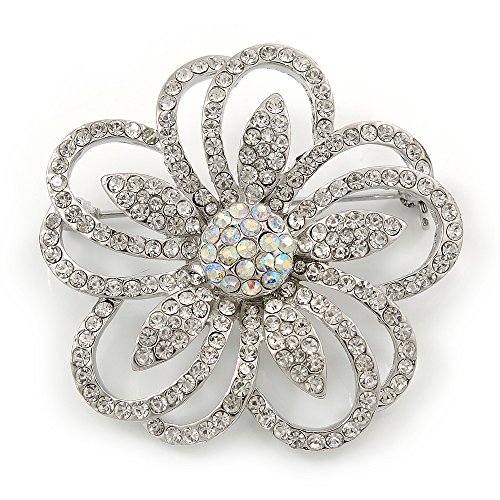 -. Title : Statement Clear & AB Austrian Crystal Flower Brooch In Rhodium Plating - 40mm Diameter