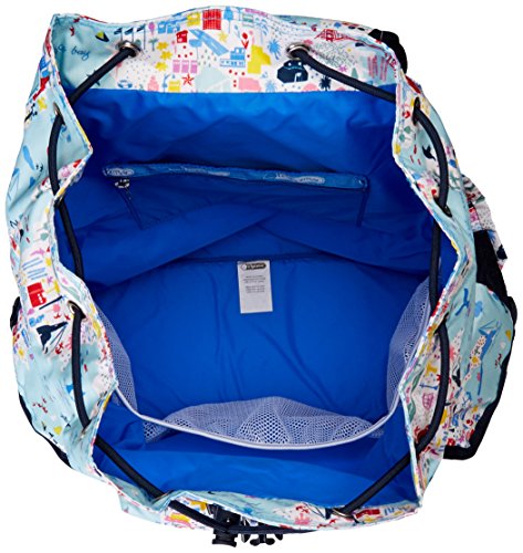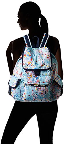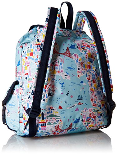 Sporty backpack in colorful stripes featuring padded/adjustable shoulder straps, flap side pockets, and fold-over flap at front