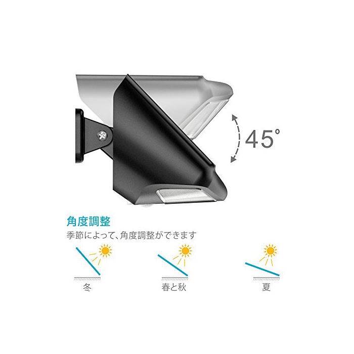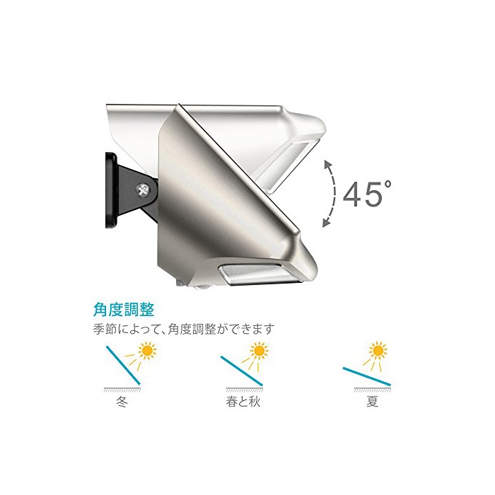 【각도 조정 할 수 있는】겨울이나 여름의 닛코 조사 각도에 의해각도 조정 를 할 수 있습니다.약45도의 조정 를 할 수 있습니다.어떤 계절이 되어도솔라 라이트의 최대 충전 를 할 수 있습니다.