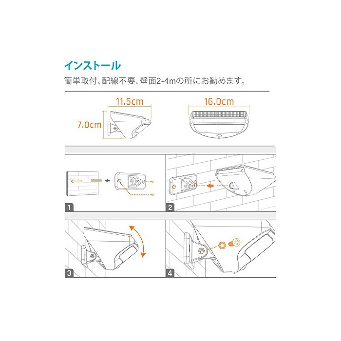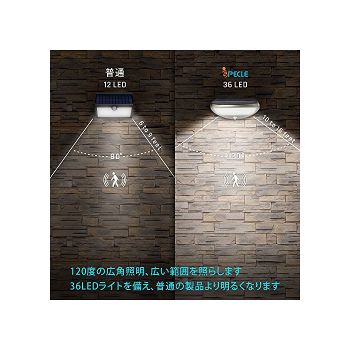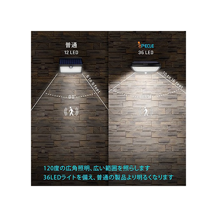 【보다 밝은 광각 조명】본 제품은 4400mAh의 대용량 전지와 36LED라이트를 구비하(갖추)기 때문에,보통의 제품 보다 밝게 됩니다.120도의 광각 조명이 되는 것으로,종래의 센서 라이트 보다 더 넓은 범위를 비춥니다.야간에 아주 멋진 조명 효과를 제공합니다.