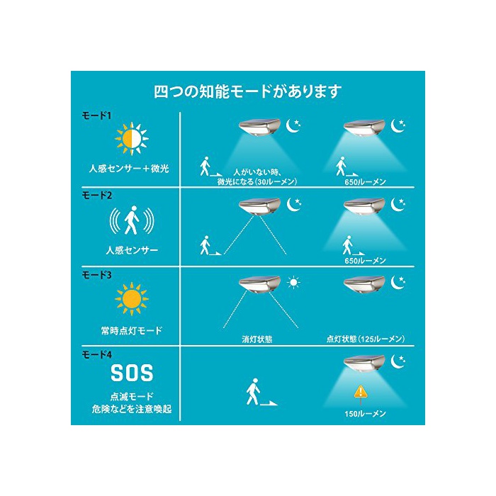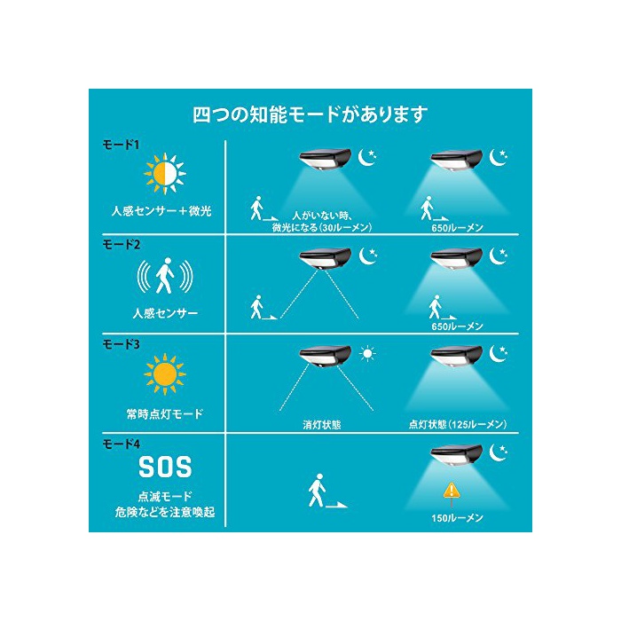 【4개의 지능 모드】인감센서+미광모드,인감센서 모드,항시 점등 모드,점멸 모드(주의 환기 모드).필요에 의해모드를 선택할 수 있습니다.낮은 자동 충전합니다,야간은 자동 점등,또는 센서 감지 범위내에서 사람의 움직임을 감지하면 자동 점등합니다.방범 효과도 기대에 옵니다.