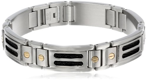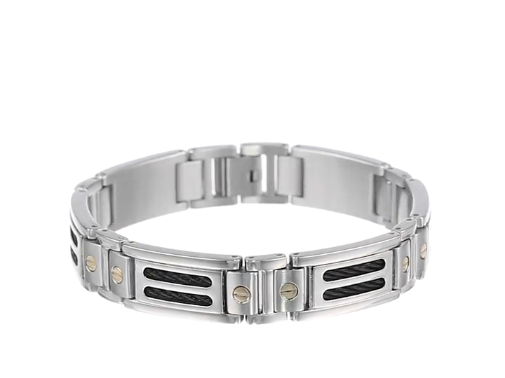 Men's Stainless Steel Black Cable Bracelet with 10k Yellow Gold Screws Accent