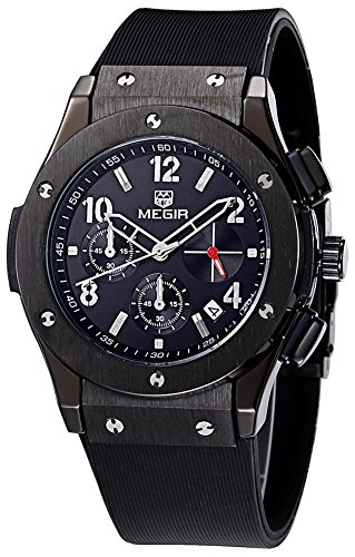 MEGIR 레이디스 실리콘 밴드 합금 케이스 크로노그래프 방수 워치 스포츠 쿼츠 손목시계 3002M (블랙)