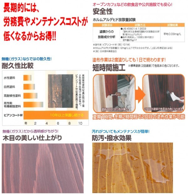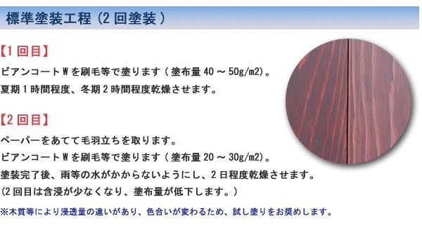 ※防腐剤入りの木材には、密着が良くない場合がございますので、密着テストをしてください。 ※ビアンコートWを薄める際にはなるべく(株)ビアンコジャパンのブタノールを使用してください。(株)ビアンコジャパン推奨の溶剤以外で薄めると、様々なトラブルの原因になる場合がございますのでおすすめしません。 ※新しい無垢木材ではなく、既存塗膜に塗る場合には、念のため、事前にメーカーへお問い合わせください。 |
