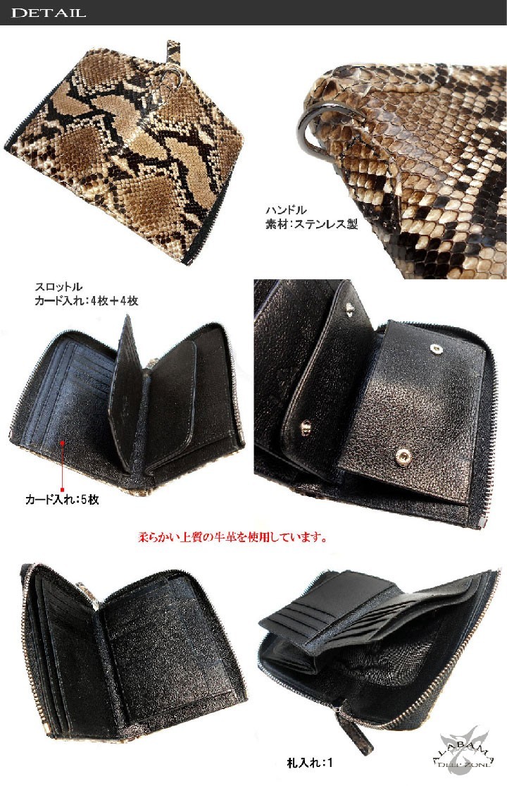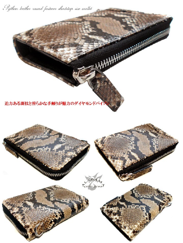 【Deep Zone】ワイルドでセクシーを上品にまとめる男のレザーブランド。自分買いからプレゼントにも人気でオススメです。迫力ある斑紋が魅力のダイヤモンドパイソン(ヘビ革)を使用したラウンファスナーウォレット。片方のサイドにファスナーを使わない事により大きく開口でき中の物が出し入れしやすくなっております。【サイズ】 H=9.5cm W=13.5cm 厚み=2.5cm【素材】 財布本体:表:ヘビ革 内側:牛革 【仕様】 カード入れ:13 札入れ:1 コイン入れ:1