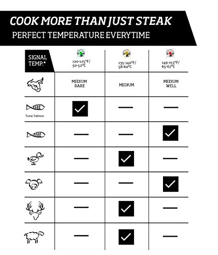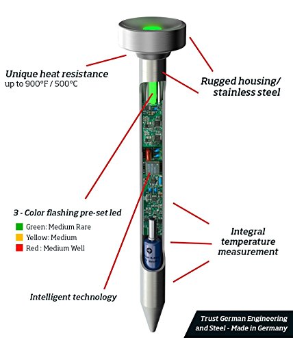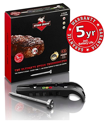 - #GERMAN PRECISION | GET THE PERFECT STEAK: SteakChamp is the ultimate steak thermometer for cooking every steak to just the right point. Engineered in Germany, its color-coder LED light indicates when your meat is ready with extreme precision. With three set temperature (green=medium rare, yellow=medium, red=medium well) you will always get your steak to your personal perfection.