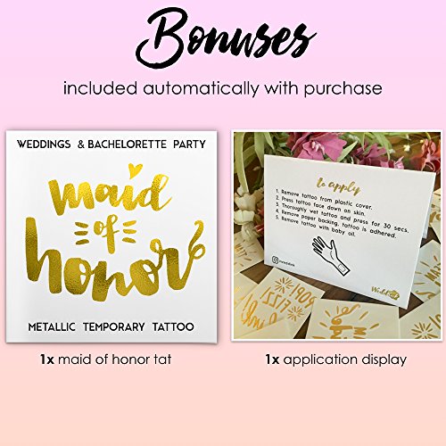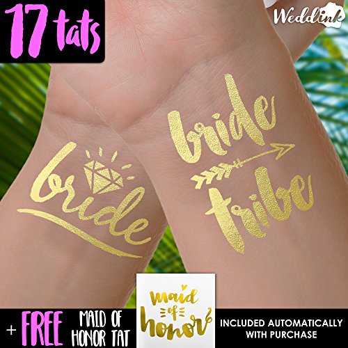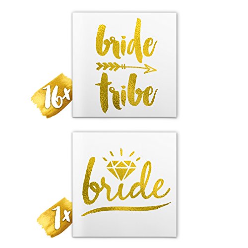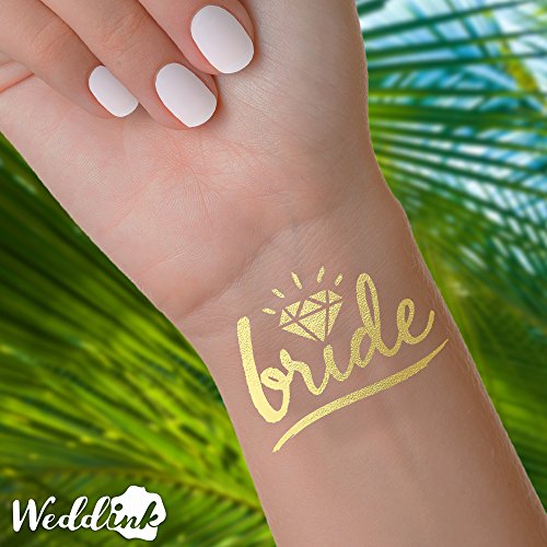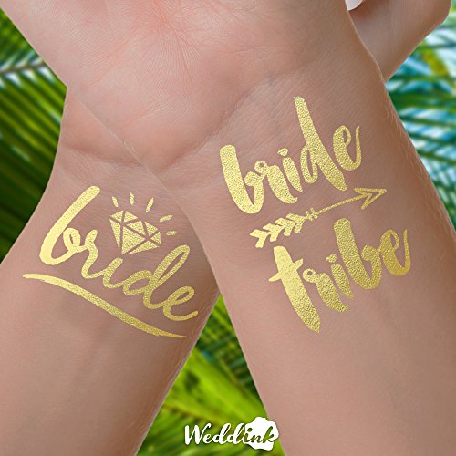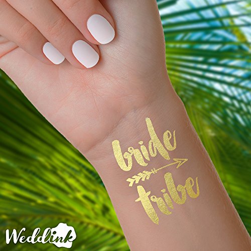 Bachelorette party newest must have. These gold foil bachelorette tattoos are great for your bachelorette party favors, wedding receptions, wedding favors, hens party, stagette party and bridesmaids gifts. THIS SET INCLUDES: - 16 x 'Bride Tribe' tattoos - 1 x 'Bride' tatoo - 1 x Application Display THE TATTOOS: - 1.5" - 2" Wide. PERFECT size for the wrist - Intended to last 2-3 days - Waterproof Weddink - The Original Wedding Tattoos - stand out from the competition by providing the most elegant, yet whimsical handwritten designs using the highest quality products & offering customer support that can not be beat. We work the hardest for your wedding reception or bachelorette party to be better than everyone else's. Using our handwritten designs from the style capital of Austin Texas, we guarantee these tattoos to be the #1 conversation and selfie starter at your event. TATTOO CARE: Application: - Ensure skin is dry and clean. - Cut out tattoo as close to the design as possible. - Remove the clear plastic cover, and place the tattoo face down onto your skin. - Wet tattoo thoroughly and press tattoo against the skin, hold for 30 seconds. - Peel off backing paper from your skin, tattoo should now be adhered. - Pat dry, don't rub. - Keep away from lotions and sunscreen. Longevity/Removal: - Tattoos can last 2-5 days depending on where applied. - To remove rub with baby oil, or rub off under the shower with a washcloth. - tattoos are waterproof and non-toxic. Do not apply to sensitive skin, your eyes, or if you're allergic to adhesives. - If irritation occurs, remove tattoo and discontinue use. CONNECT WITH US: Pinterest: https://www.pinterest.com/weddinktats/ Instagram: https://www.instagram.com/weddinktats/ Facebook: https://www.facebook.com/weddinktats/ Twitter: https://twitter.com/weddinktatsFeature