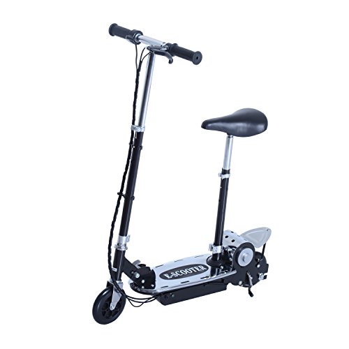 -. Brand : Aosom -. Color : Black -. EAN : 0842525103657 -. Feature : Top speed of 8.1 mph making it ideal for older riders / Larger deck and frame for teens and adults / Folding function for simple storage and transport / Kickstand for easy parking storing of your scooter / Includes charger -. IsAutographed : 0 -. IsMemorabilia : 0 -. Label : Aosom -. Manufacturer : Aosom -. MPN : AA1-027BK -. PackageQuantity : 1 -. PartNumber : AA1-027BK -. ProductGroup : Sports -. ProductTypeName : OUTDOOR_RECREATION_PRODUCT -. Publisher : Aosom -. Studio : Aosom -. Title : Aosom 120W Teen Folding Electric Scooter with Seat - Black -. UPC : 842525103657