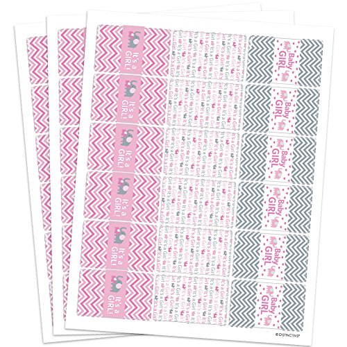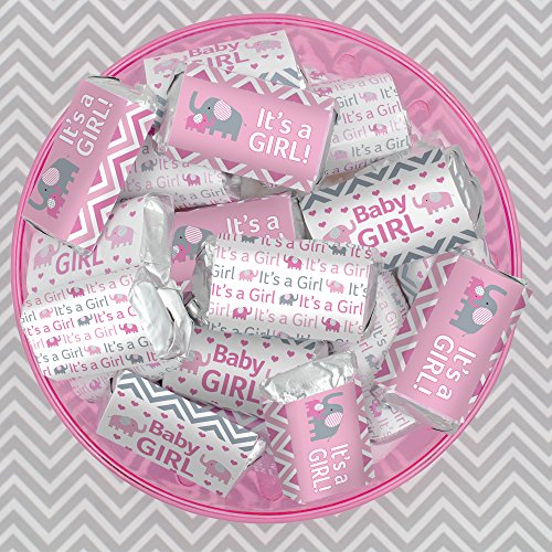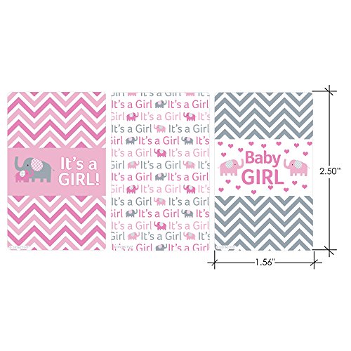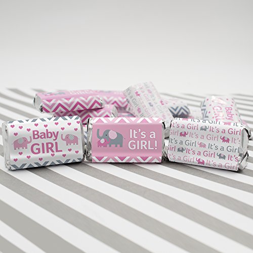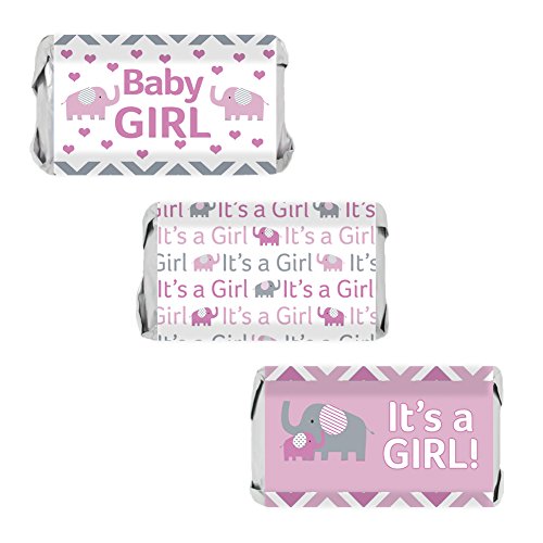 Pink and Gray Elephant Baby Girl Shower Miniatures Candy Bar Wrapper Stickers (Set of 54)