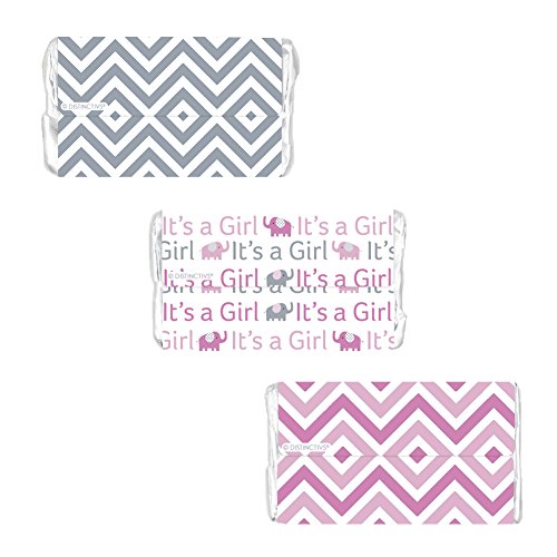 "Designs include: Baby Girl with Two Elephants and Hearts on Gray Chevron Background, It's a Girl with Elephants on a White Background & It's a Girl with Two Elephants on Pink Chevron Background. "