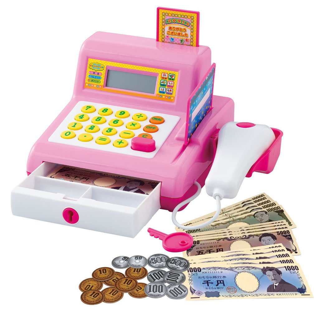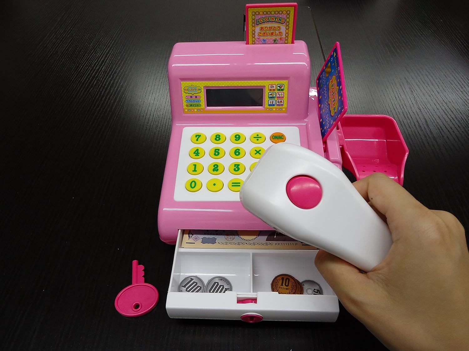 お店屋さんごっこが楽しくなっちゃう本物そっくりのレジスターが登場! ハンドスキャナーで商品をピッピッ! ボタンを押すと光ります。電卓機能が内蔵されているので、計算もできます。お金パーツやカギもついていてます。[セット内容]【各1個】本体、カード、カギ コイン(紙製)計16個 お札各5枚