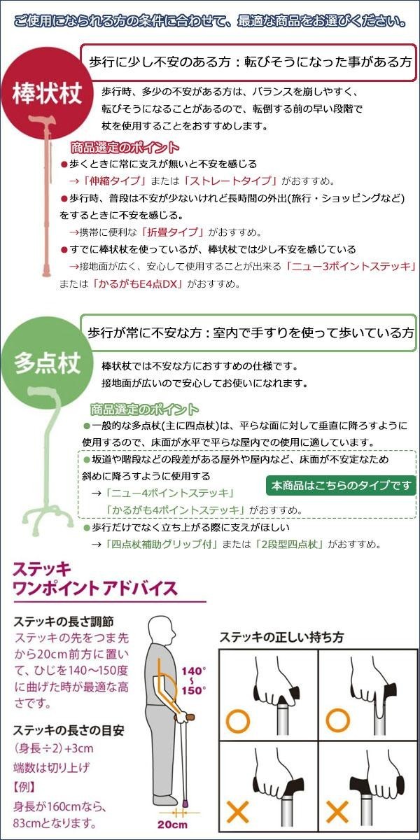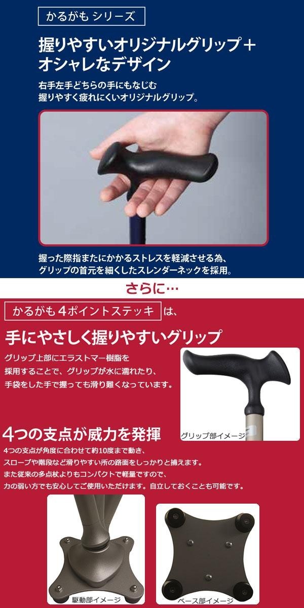 | かるがもシリーズは握りやすいオリジナルグリップを採用しています。ベース部にジュラルミンを採用し、軽量化を実現。4つの支点がしっかり路面を捕えるので、力の弱い方でも安心してご使用いただけます! |