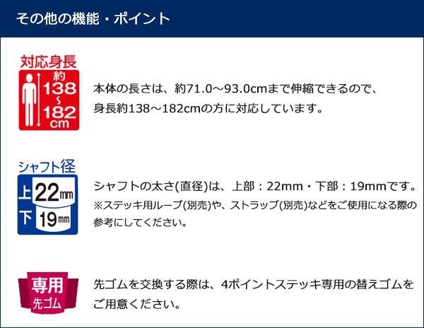 | 素材・材質 | グリップ:ABS樹脂、エラストマー シャフト:アルミニウム ベース部:ジュラルミン 石突:アルミニウム 先ゴム:合成ゴム |