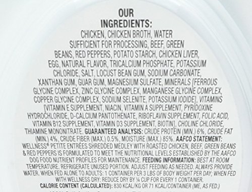 -. Feature : Contains (1) pack of 24 Wellness petite entrees shredded Medley chicken & Beef 3 oz cups / Grain free: Grain free, complete and balanced everyday Nutrition for your small breed dog / For small breeds: delicious shredded Medley of quality ingredients like chicken & Beef in Gravy specially formulated to meet the unique needs of small breed dogs