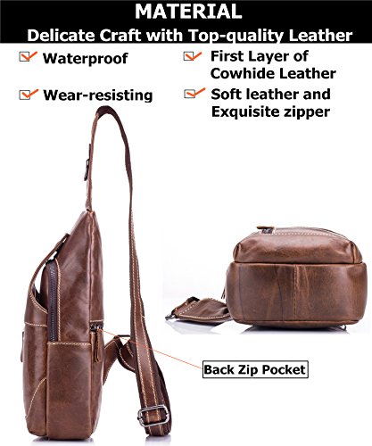 -. Feature : [Material /Fabric]: High quality first layer cowhide leather(Genuine products. 100% brand new, original and high quality) with breathable polyester lining. / [Color]: Brown. Please allow little color difference due to the monitor and light brightness. / [Dimension]:5.9(L)*3.15(W)*11.81(H)(in). Please allow 0.3"-0.9" in size error due to manual measurement. / [Structure]: This chest pack with multiple pockets.Consists of one zippered main bag, One front pocket and one back pocket, one inner zip pocket and one card pocket to safely store and organize your cellphone, ipad mini, 10" tablet, wallet, keys, ID card, credit card, small snacks,books and other small personal belongings. / [Features]: A hole for headphone outside provides an easy access to earphone usage. You can listen to your favorite music on the go hands-free. Stylish, multi-function and practical design. Ideal for outdoor sports (hiking, camping, climbing, cycling, etc) and travel use.