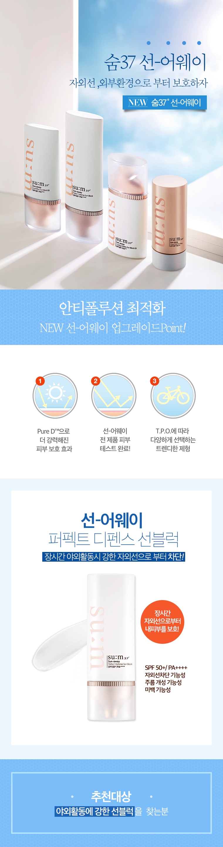 | Pure D™ increase skin elasticity and purify from city fine dust and harmful factors. Vitamin C derivatives, polyphenols, and tocopherols when exposed to skin irritants such as ultraviolet rays or fine dusts Prevents various inflammatory reactions. Protects your skin from strong ultraviolet rays and reduces blue light transmittance when you are outdoors for a long time. Face and body sun to block ultraviolet rays in outdoor activity, strong on sweat and water Soft cream type |