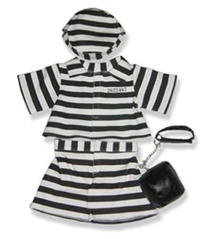 -. Feature : Teddy bear P.R.Ison outfit / black and white striped fabric / includes ball and chain / fits 15 inch plush / 2 piece outfit