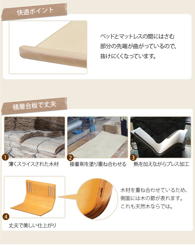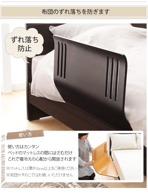 商品について:ベッドのマットレスにはさむだけで布団のずれ落ちを防止するベッドガード。木製なので触ってもひんやりしません。木製のぬくもりあふれた仕上がりになっています。