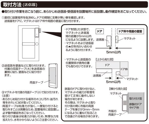 | ドアセンサー送信器と受信器のセットです。ドアが開いたら電波を送信し、受信器のチャイムでお知らせします。 |