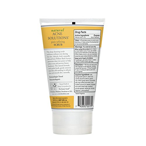 Refine the appearance of pores and prevent future breakouts with Burt's Bees Natural Acne Solutions Pore Refining Scrub. It's clinically shown to exfoliate dead skin cells while refining the appearance of pores. This 99.0% natural formula contains jojoba beads and a natural fruit acid complex for gentle exfoliation without over-drying or irritating skin. Also, formulated with salicylic acid, derived naturally from willow bark, to penetrate clogged pores, reduce acne and help prevent future breakouts. For best results, target acne with the entire line of Burt's Bees Natural Acne Solutions. Give your skin the best nature has to offer with Burt's Bees.Feature