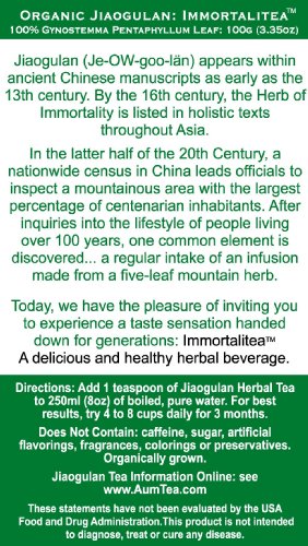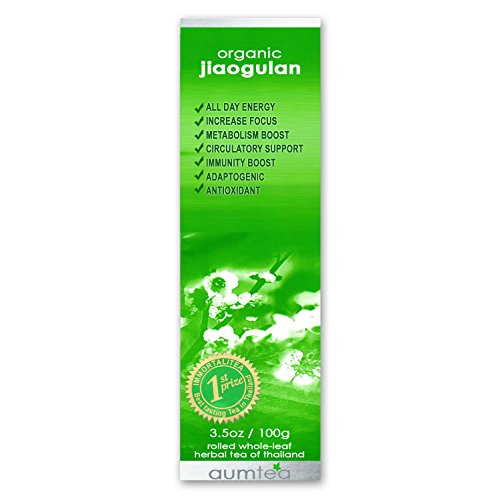 -. Binding : Misc. -. Brand : Aum Tea Company -. EAN : 0853032002135 -. Feature : ALL DAY ENERGY & FOCUS: Lift your vitality and concentration with slow release natural energy from Organic 5-Leaf Jiaogulan/Gynostemma Pentaphyllum Immortalitea. Natural stimulation without caffeine means no post-coffee/soda/tea crash. / CALORIE BURNING BOOSTER: Support your weight loss goals with an all-natural, adaptogenic way to increase your body's metabolism. CIRCULATORY SYSTEM SUPPORT: Scientifically proven heart regulator. MINI-INFO-BOOKLET: Includes 18 Jiaogulan Q & A's, Connoisseur Tips and Facts. / IMMUNE SYSTEM SUPPORT: Natures perfect answer to a fast pace life-style. You'll get all the help you need to stay in balance and healthy during cold/flu/allergy seasons & during times when you are on-the-go when relief is most important. / NATURE'S MOST POWERFUL ADAPTOGEN: 82 Saponins, 4x more than Ginseng. Truly a wonder herb & long life vitality tonic. Our bitter-sweet Jiaogulan has 7.76% gypenosides (active ingredient). 3.5oz/100g/100 cups for less than 30 cents a cup. / AWARD WINNING TASTE OF THAILAND: Our whole leaf Jiaogulan does not require a tea bag. Put the leaves in a cup and let them sink to the bottom. The longer it sits, the better it tastes. ISO 9002 GAP & GMP Certified. 12 to 18 month shelf-life. -. IsAdultProduct : 0 -. Label : Aum Tea Company -. Manufacturer : Aum Tea Company -. Model : 1JAI-0100-001 -. MPN : 1JAI-0100-001 -. NumberOfItems : 1 -. PartNumber : 1JAI-0100-001 -. ProductGroup : Grocery -. ProductTypeName : GROCERY -. Publisher : Aum Tea Company -. Studio : Aum Tea Company -. Title : 100g (3.5oz) Organic 100% Loose Leaf Jiaogulan Herbal Tea -. UPC : 853032002135