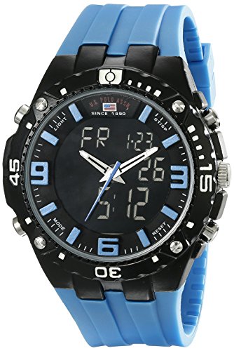 -. Binding : Watch -. Brand : U.S. Polo Assn. Sport -. Department : mens -. EAN : 0030506291350 -. Feature : Black dual-display watch with screw-accented bezel featuring multiple functions such as backlight, alarm, timer, and date / 52 mm metal case with glass dial window / Quartz movement with analog-digital display / Silicone band with buckle closure / Not water resistant -. IsAdultProduct : 0 -. Label : U.S. Polo Assn. Sport -. Manufacturer : U.S. Polo Assn. Sport -. Model : US9175 -. MPN : US9175 -. PackageQuantity : 1 -. PartNumber : US9175 -. ProductGroup : Watch -. ProductTypeName : WATCH -. Publisher : U.S. Polo Assn. Sport -. ReleaseDate : 2013-04-19 -. Studio : U.S. Polo Assn. Sport -. Title : U.S. Polo Assn. Sport Men's US9175 Black Ana-Digi Watch with Blue Silicone Band -. UPC : 030506291350