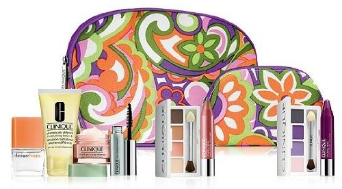 -. Feature : 2 pc. Comsetic Bag Set By Clinique / Purple Flower Design / One Large Bag, One Smaller Bag / Large: Approximately 9 x 6 x 2 inch / Small: Approximately 5 x 3.5 x 2 inch