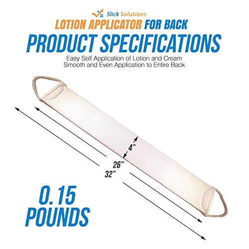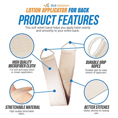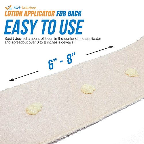 Applying lotions and creams to your back has never been easier with the Slick Solutions Back Lotion Applicator! - Do you have problems applying lotions or creams to your back? - Tired of asking a friend or family member to apply lotion on your back for you? - Sick of other lotion applicators that simply don't get the job done effectively? Slick Solutions introduces a simple yet most effective way to apply lotion and creams to your back. Unlike most back lotion applicators, that have a pad on a stick, this application "band" will evenly spread lotions to your entire back. No more waiting for the lotion to dry. The soft velvet fabric partially absorbs the lotion which causes the lotion to rub into your skin. This gives you a more thorough and evenly spread application. ? No longer will you have to ask a family member to apply lotion to your back. ? No longer will you need to buy replacement pads for other applicators. This back lotion applicator is all you need. When it gets dirty, simply throw it in the washing machine with your laundry and you are good to go. Get your Back Lotion Applicator today! Please click the add to cart button.