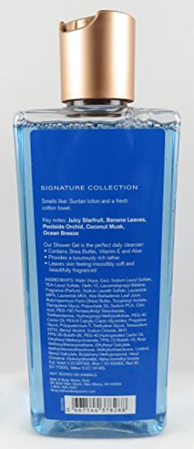 -. Feature : Bath & Body Works / Cabana Breeze scent is a blend of Juicy Starfruit, Banana Leaves, Poolside Orchid, Coconut Musk, Ocean Breeze / One 8 ounce shea and vitamin E shower gel / Limited Edition 2017 scent featuring clear palm trees and blue packaging / Smells like: Suntan lotion and a fresh cotton towel
