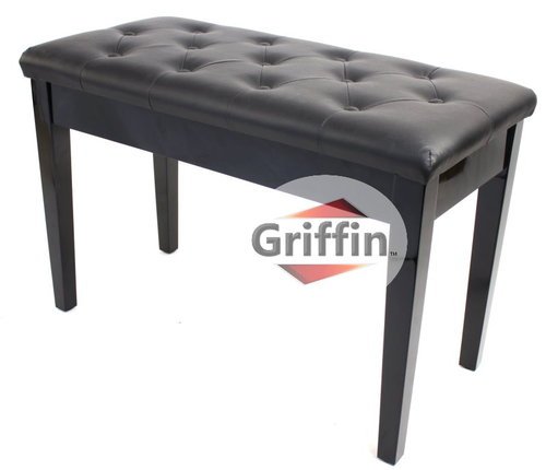 -. Title : Ebony Black Leather Piano Bench Wood Double Duet Keyboard Seat with Storage Griffin