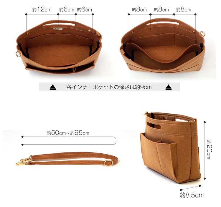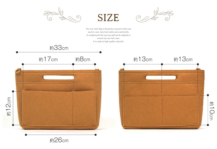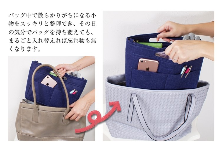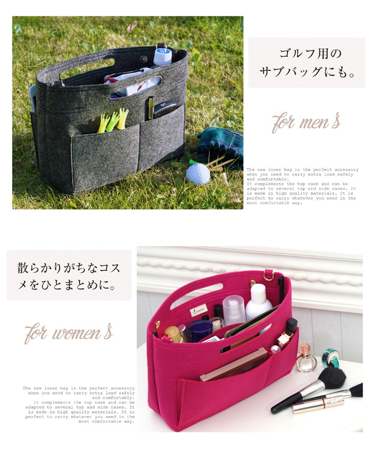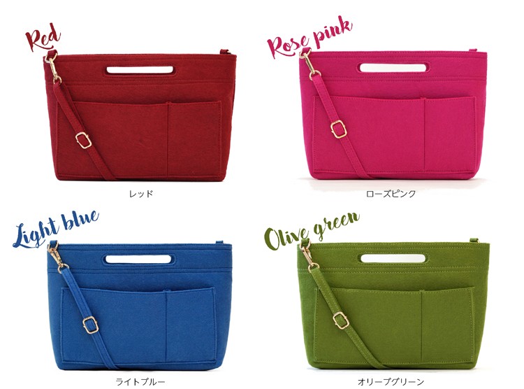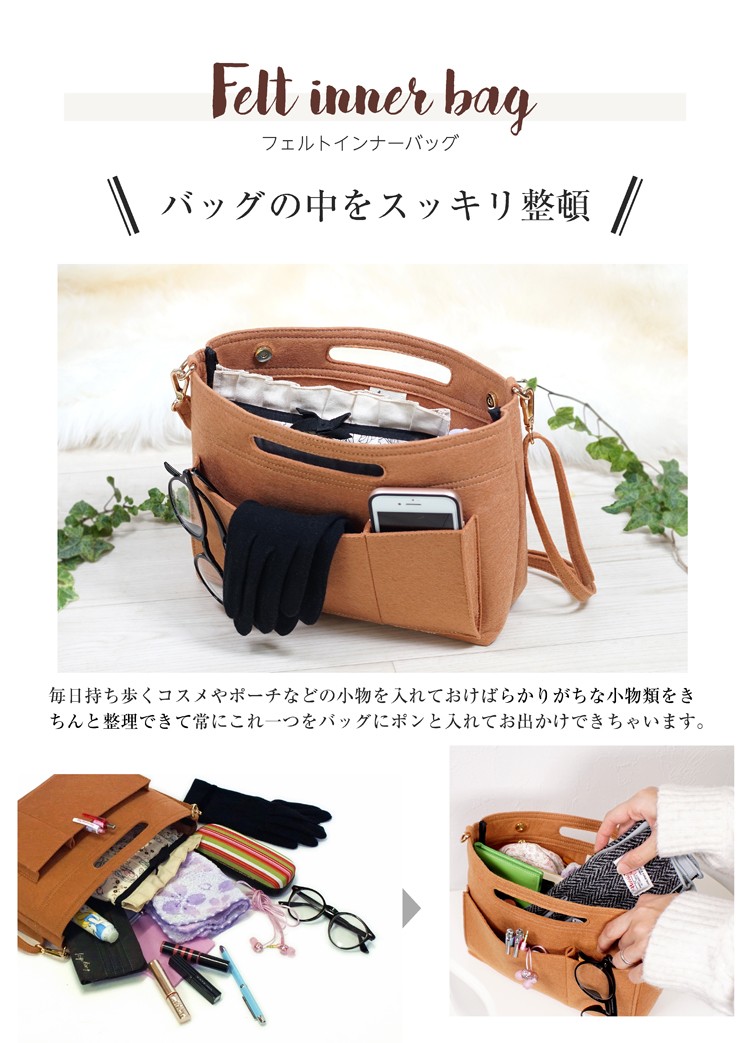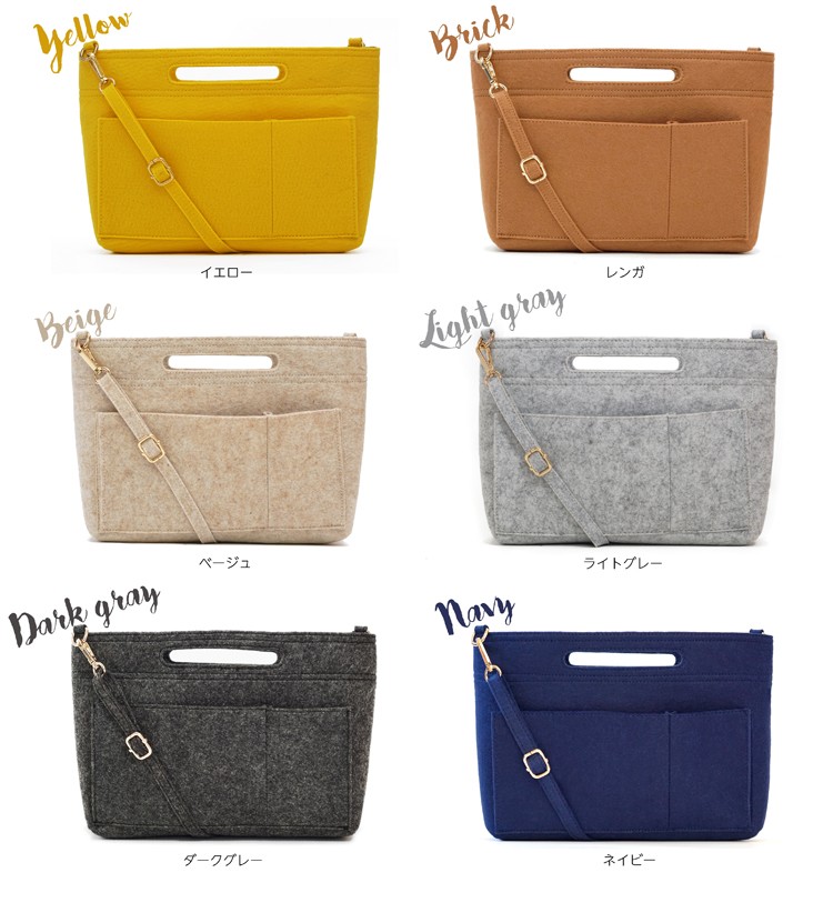 毎日持ち歩くコスメやポーチなどの小物を入れておけばらかりがちな小物類をきちんと整理でき, 常にこれ一つをバッグにポンと入れてお出かけできちゃいます。 軽くて丈夫なポリエステル素材のフェルト素材を使用。 型崩れしにくく、厚みもあるので安定して身の回りのものを収納できます。 ショルダーストラップ付きだからショルダーバッグに変身! |