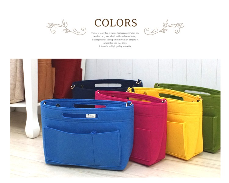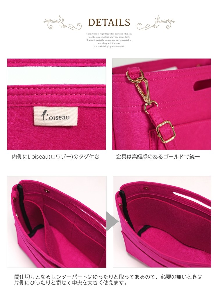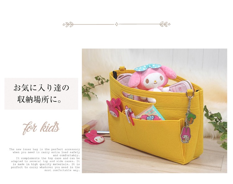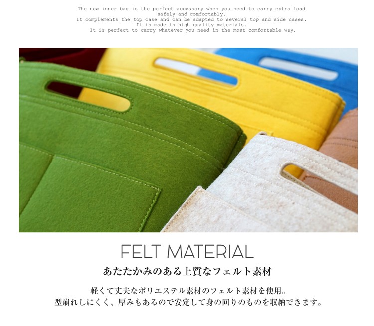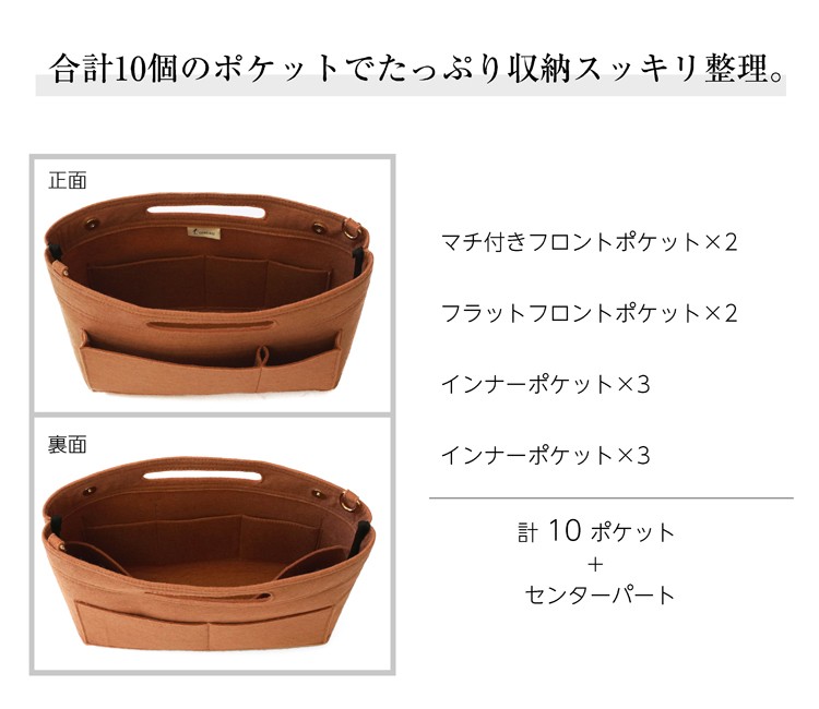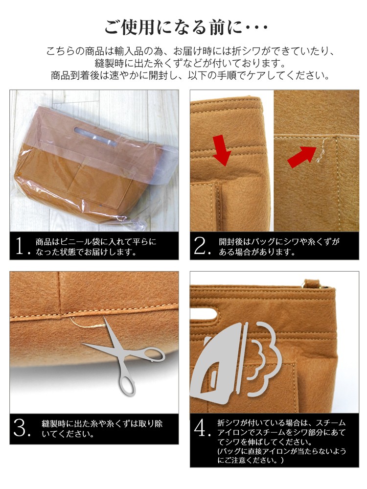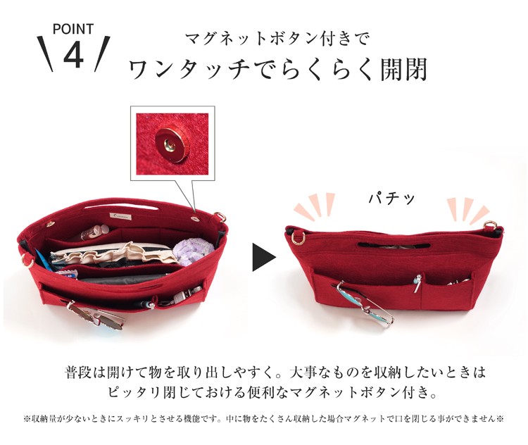 毎日持ち歩くコスメやポーチなどの小物を入れておけばらかりがちな小物類をきちんと整理でき, 常にこれ一つをバッグにポンと入れてお出かけできちゃいます。 軽くて丈夫なポリエステル素材のフェルト素材を使用。 型崩れしにくく、厚みもあるので安定して身の回りのものを収納できます。 ショルダーストラップ付きだからショルダーバッグに変身! |