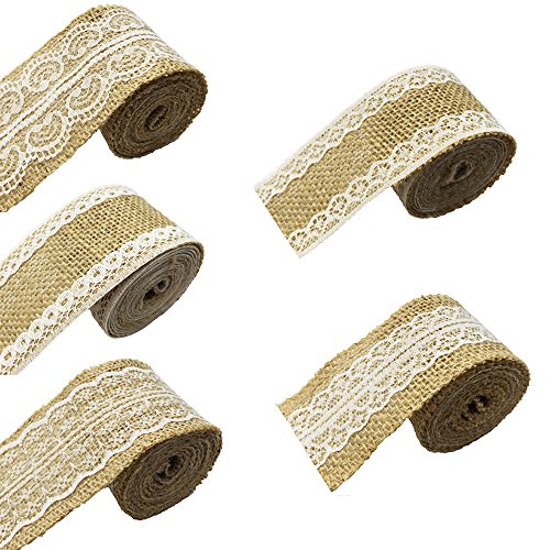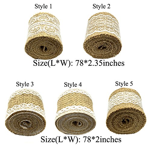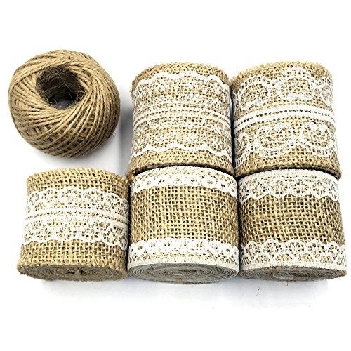 Package Includes: Mixed 5 pieces burlap roll with white lace(Each Burlap roll is around 2 yards) and 30 Yards Jute Twine