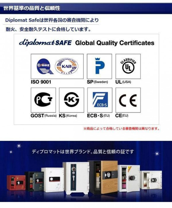 | 仕様 | 容量:24L ロック方式:EDL77テンキー式ロック+ディンプルキー+鍵付き内扉 耐火時間:60分 収納サイズ:A4 使用電池:単三電池×4本(付属) |
