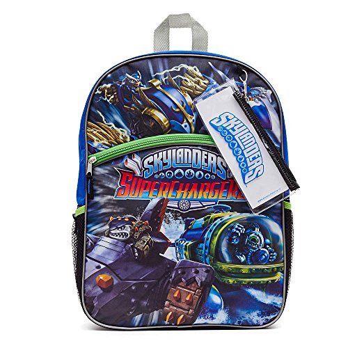 -. Binding : Toy -. Brand : Skylanders -. Color : Blue and Black -. Department : boys -. EAN : 0688955851993 -. Feature : Features a roomy main compartment, a front zippered pocket and 2 side mesh pockets / Also includes a pencil pouch and sticker sheet / Reflective material on the front for safety and style / Officially licensed. -. IsAdultProduct : 0 -. Label : Skylanders -. Manufacturer : Skylanders -. MPN : 6795106 -. NumberOfItems : 1 -. PackageQuantity : 1 -. PartNumber : 6795106 -. ProductGroup : Toy -. ProductTypeName : TOYS_AND_GAMES -. Publisher : Skylanders -. Size : 16 Inch -. Studio : Skylanders -. Title : Skylanders Superchargers 16 inch. Backpack -. UPC : 688955851993