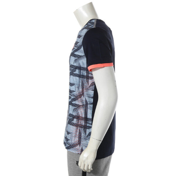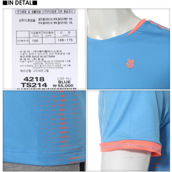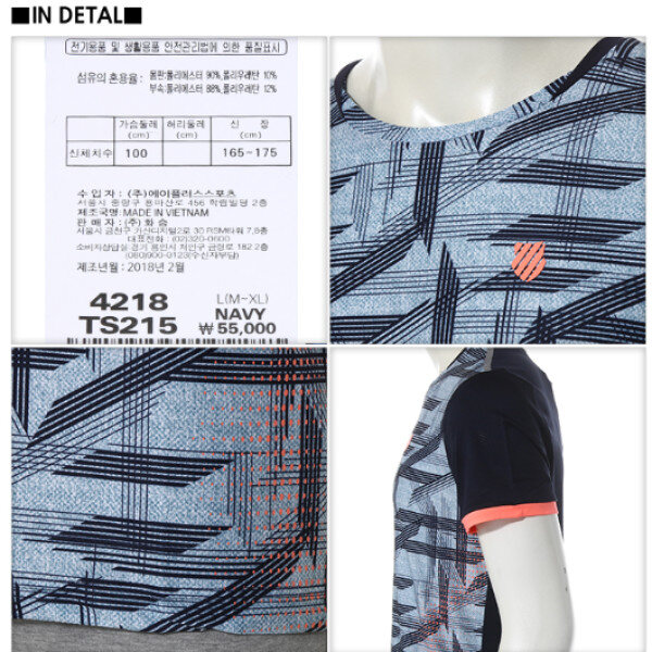 착용시 시원하고 텐션이 좋은 원단을 사용하여 일상 생활은 물론 운동시 쾌적함을 유지할수 있음.조직감있는 원단과 통기성이 있는 메쉬원단이 소매와 등판에 사용됨. 컬러블록에 테니스 라인 BI를 넣었으며, TS213은 전판 프린트를 사용하여 트렌드한 감성을 연출함.