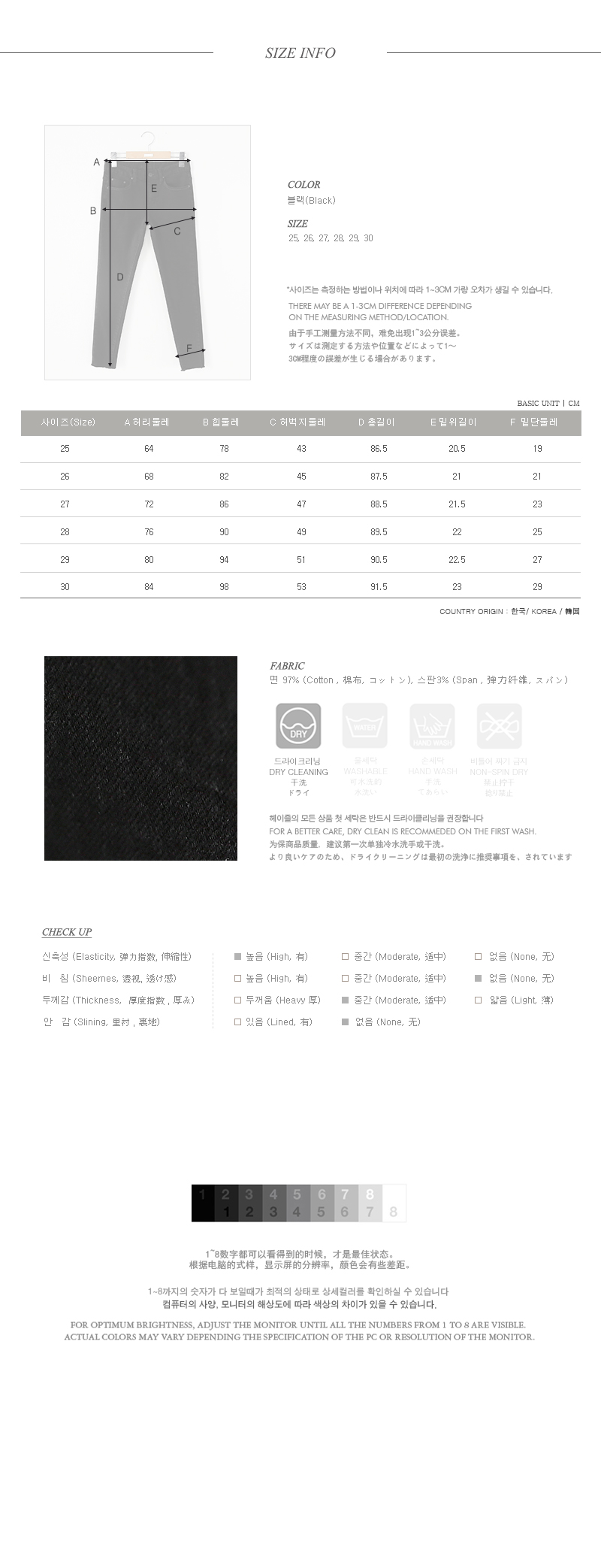 고민없이 매치하기 좋은 블랙스키니! 한벌쯤은 갖고있어야 할 아이템이죠^^ 타이트한 스키니핏으로 날씬한 바디라인을 보여주는 아이템이구요 신축성이 좋아 착용감까지 편안하답니다! 군더더기없는 심플한 디자인으로 어디에나 매치하기 좋은 블랙팬츠구요 밑단 커팅라인으로 밋밋함없이 섬세한 디테일을 보여주는 아이템이에요^^ 캐주얼룩,페미닌룩 등 어떤룩에나 잘 어울리는 데일리 스키니로 추천해요~